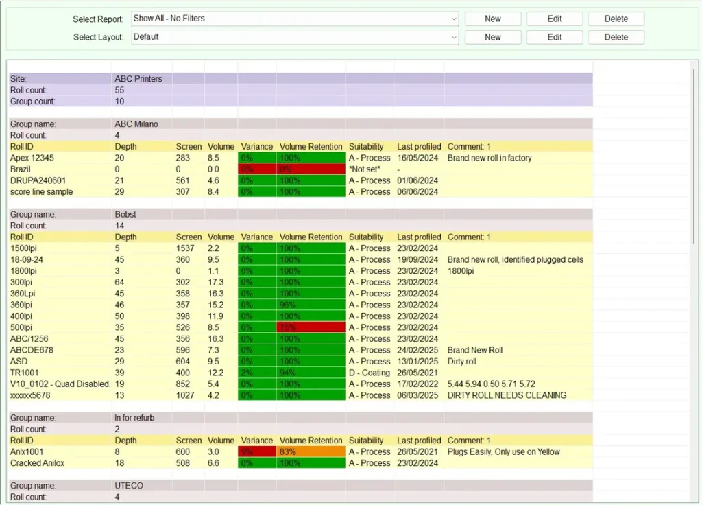 The Anilox Management System (AMS) gives printers a complete view of their anilox inventory. Each roll is logged with a unique ID, screen count, supplier details, and initial volume readings across multiple points.